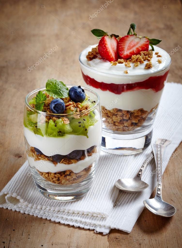 WHITE BACKGROUND ON GLASS FRESH HEALTHY NATURAL BROWN WOODEN DIET SPOON CREAM FRUIT TASTY DELICIOUS SWEET HOMEMADE BREAKFAST DESSERT SAUCE BERRY VEGETARIAN GOURMET TWO FINGERS WITH ORGANIC DAIRY FIBER ASSORTMENT CEREAL STRAWBERRY DIFFERENT BERRIES JAM LAYER KIWI BLUEBERRY DECORATED VANILLA OAT TABLECLOTH AND LADIES CURD CORPORAL YOGURT DESSERTS LAYERED MUESLI