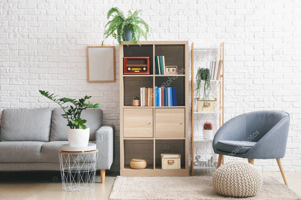 - Interior of modern room with shelf units, sofa and armchair
