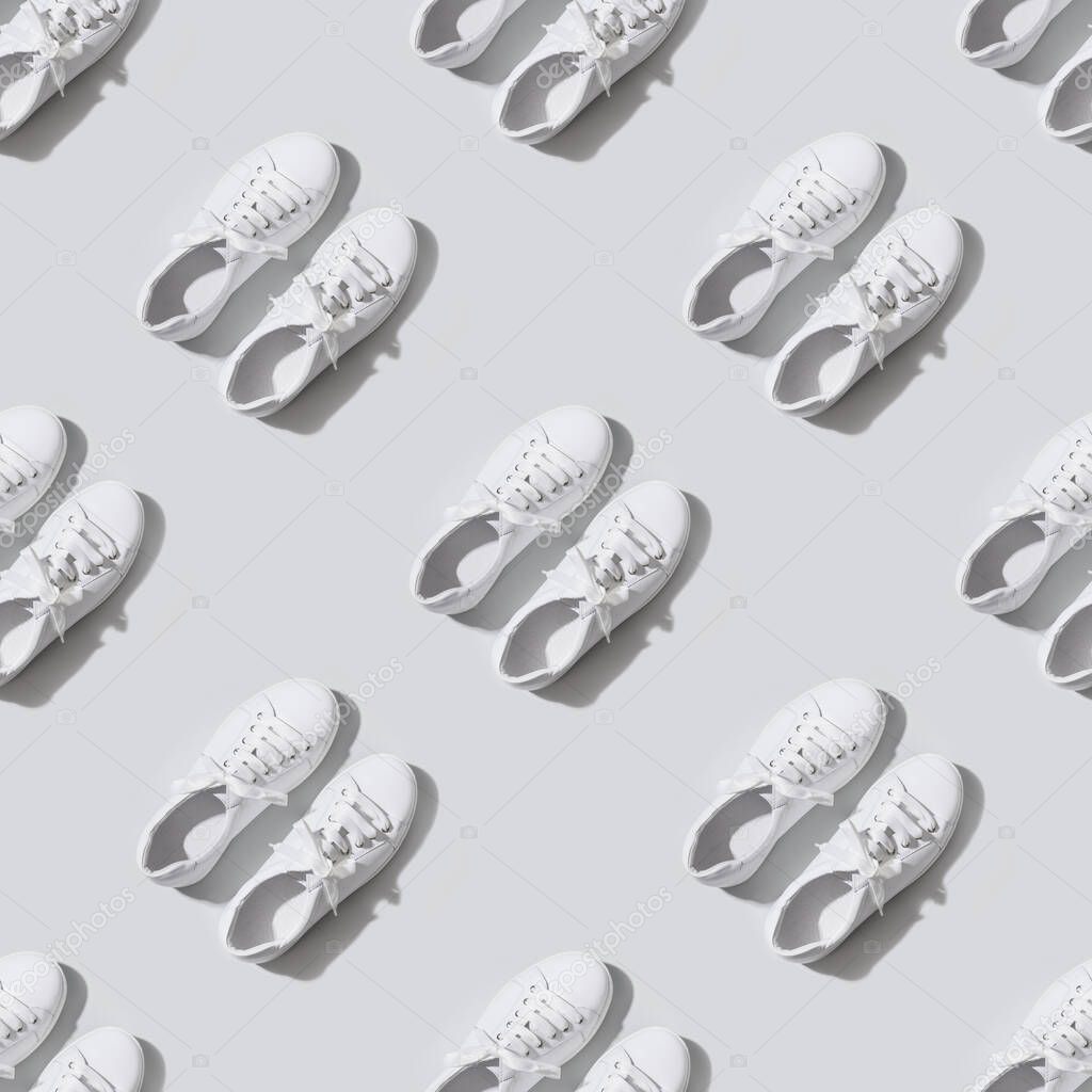 Seamless pattern of white female new gumshoes on grey background. Sport and casual outfit.