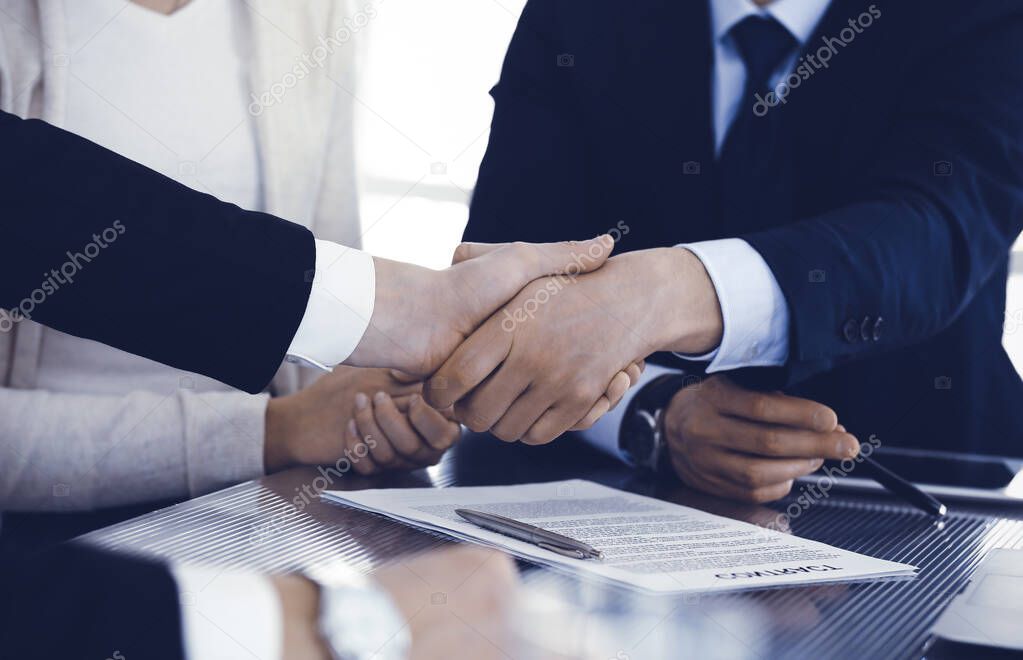 Business people shaking hands after contract signing in modern office. Teamwork, partnership and handshake concept