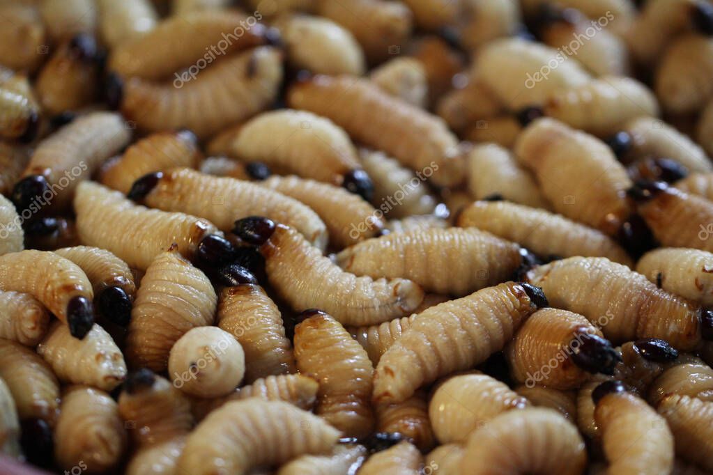 - Group of oragnic Living edible palm weevil larvae (Rhynchophorus phoenicis), Rhinoceros beetle at traditional food market in the national jungle forest, protein source, advertisement backgrounds