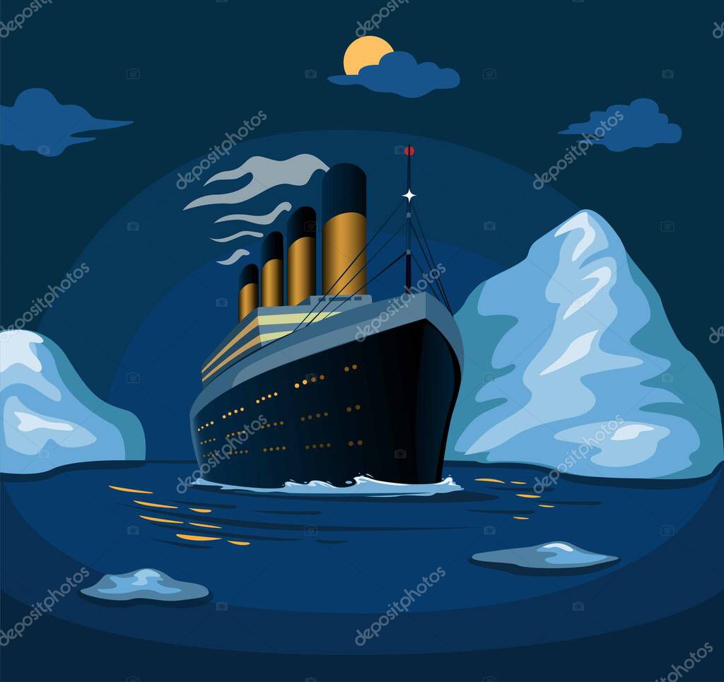 - Titanic cruise ship sail in sea iceberg in night scene illustration in cartoon vector