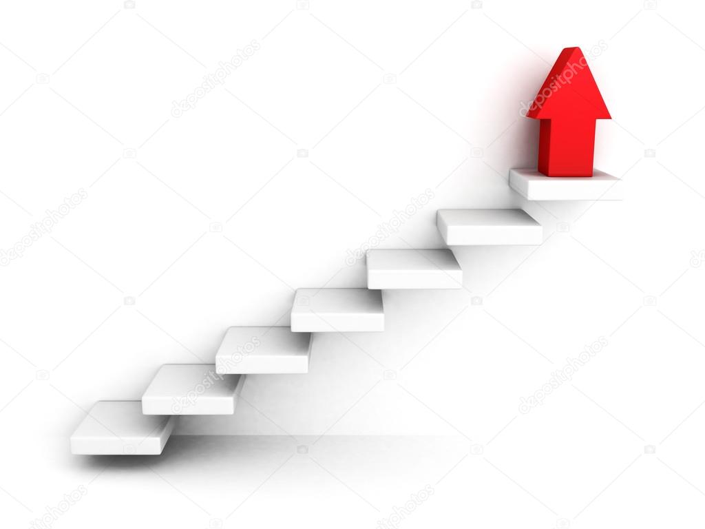 Red growing up success arrow and upstairs steps ladder. 3d render illustration