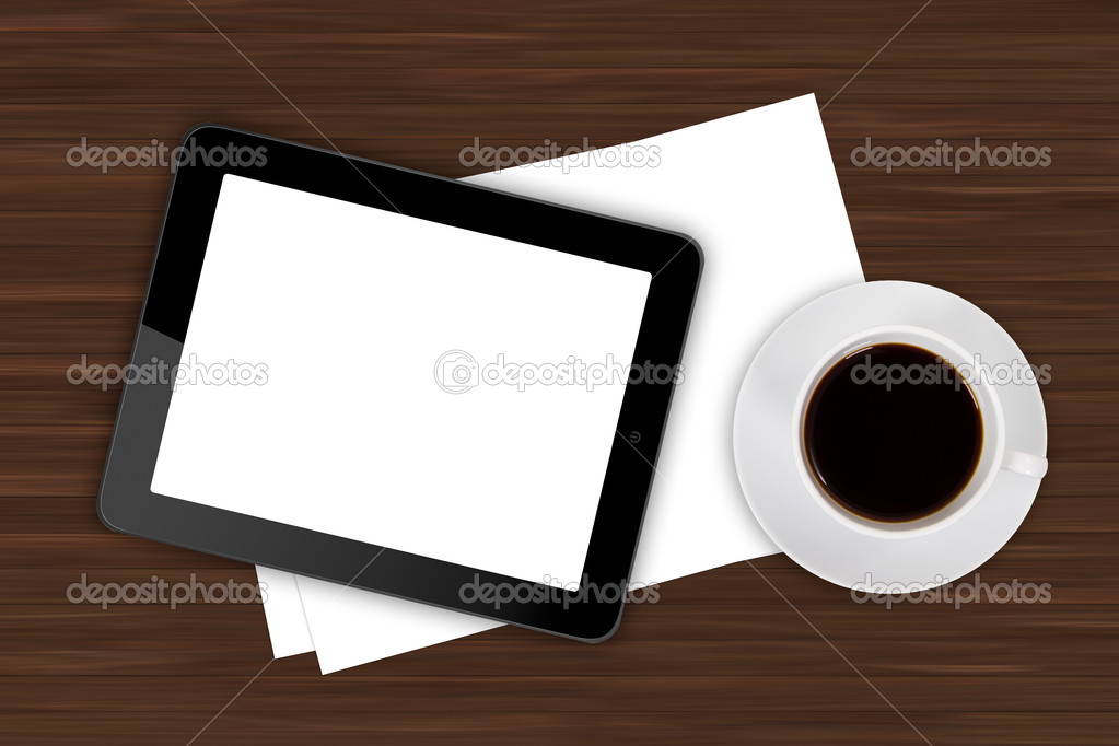 Top view of business workplace, digital tablet with white blank empty screen and cup of black coffee drink on wooden office table.