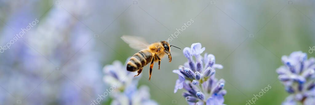 - Honey bee pollinates lavender flowers. Plant decay with insects., sunny lavender. Lavender flowers in field. Soft focus, Close-up macro image wit blurred background.