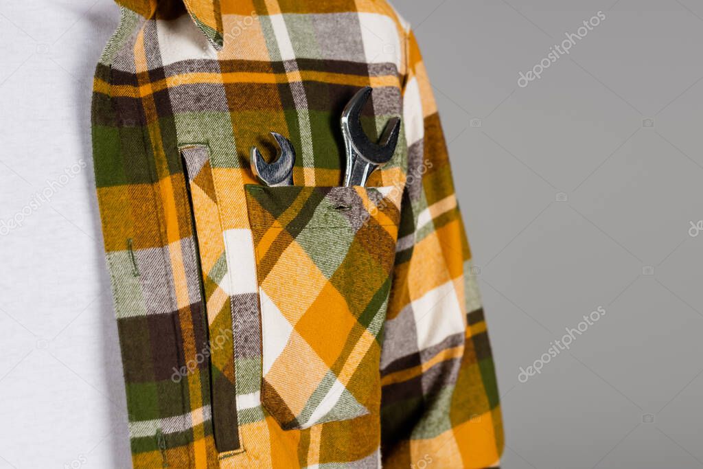 Cropped view of foreman with wrenches in pocket of plaid shirt isolated on grey, labor day concept