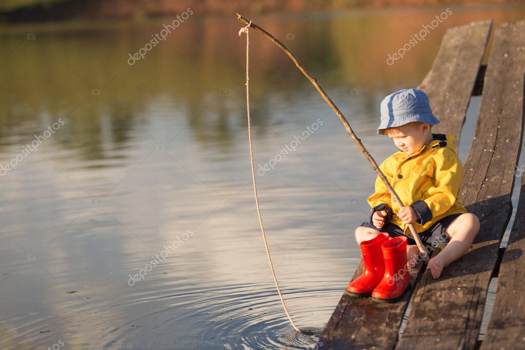 - Little Boy Catching a Fish from wooden dock