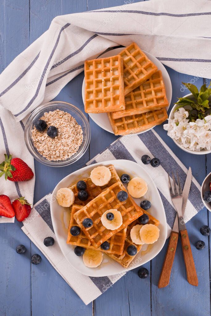 - Waffles with blueberries, bananas and honey.