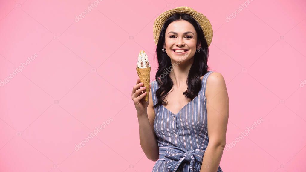 Smiling woman in straw hat holding ice cream isolated on pink