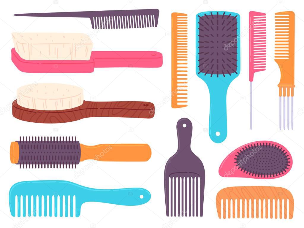 - Cartoon hairbrushes and professional comb for hair styling. Curling and style brush. Hairdresser, stylist and beauty salon tools vector set