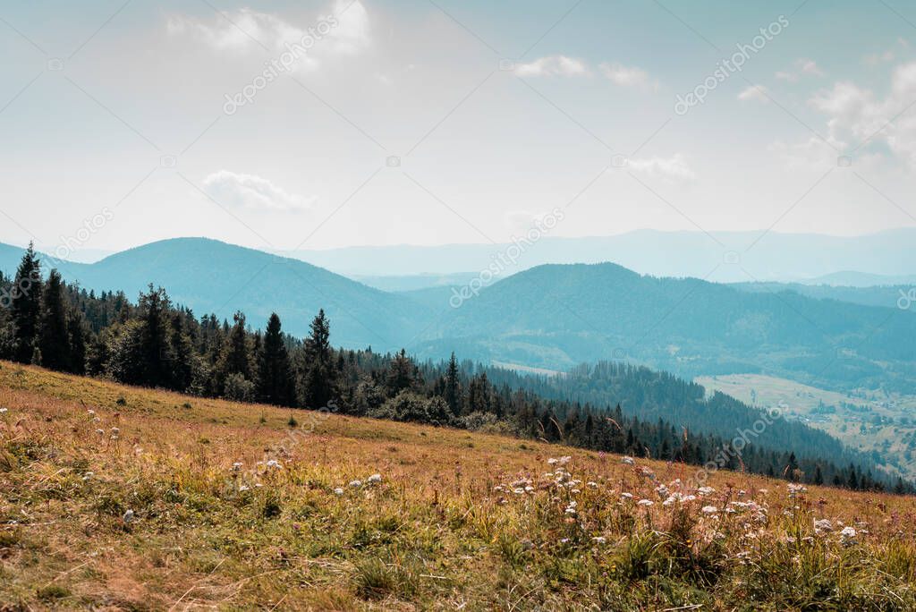 Fascinating panorama of sunset and landscape in the mountains on the hill, Ukrainian Carpathians mountains. Colored and their mountain landscapes. Nature concept