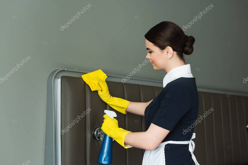 - side view of young maid in rubber gloves holding spray bottle and rag while cleaning hotel room