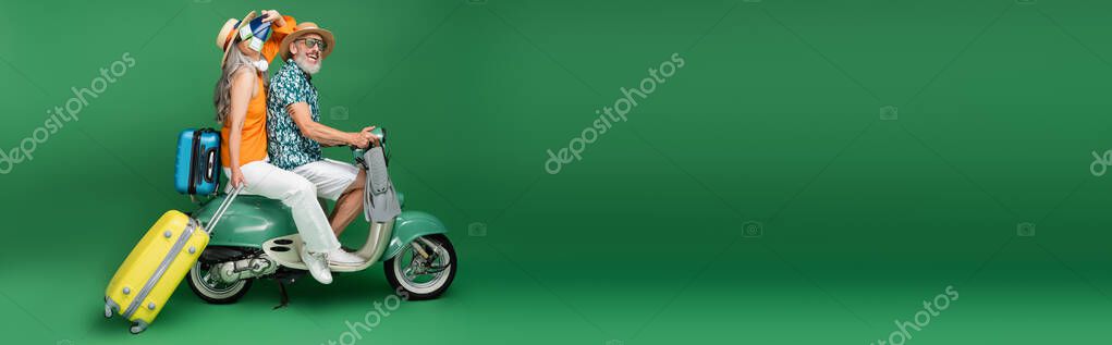 Mature asian woman in sun hat covering face with passports near husband holding flippers while riding moped on green, banner