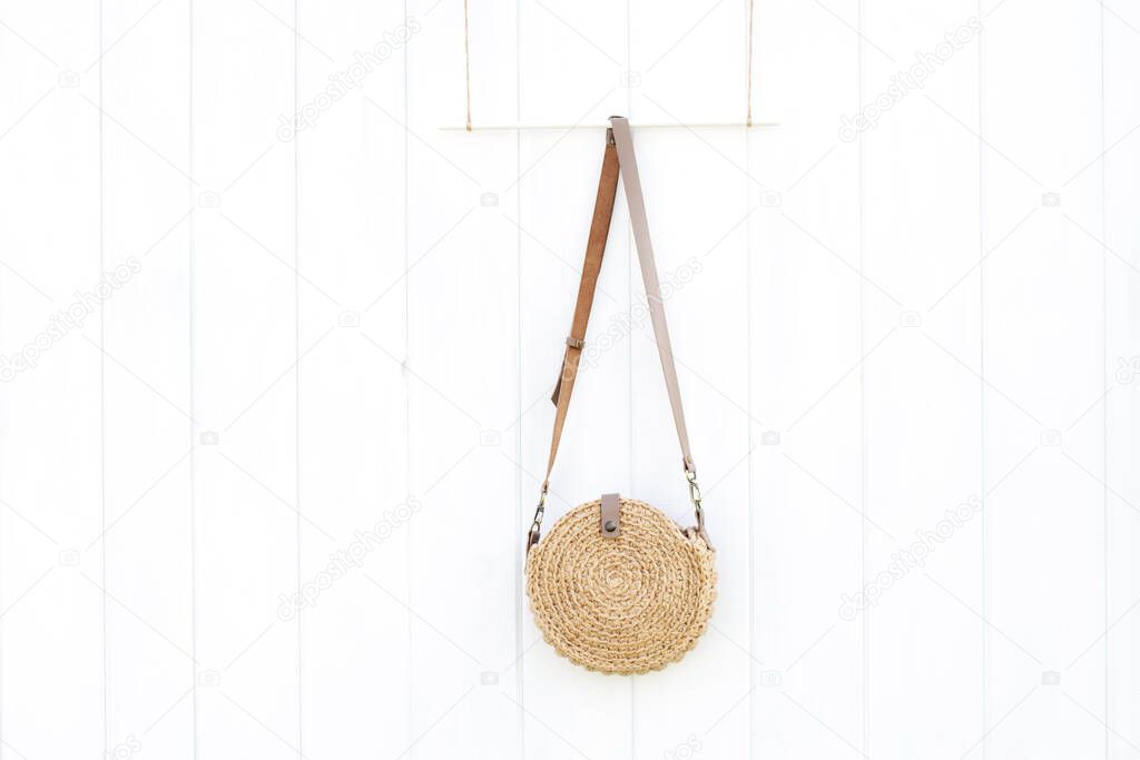- Beautiful handmade jute bag on white wooden wall, boho style, summer vacation concept. Place for text.