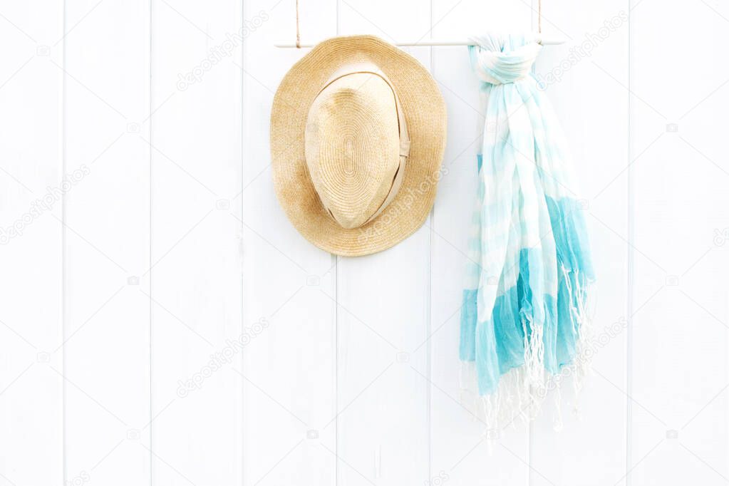 - Beautiful summer scarf and hat on white wooden wall, boho style and minimalism concept. Place for text.