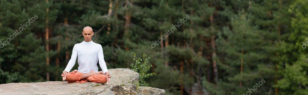 buddhist in white sweatshirt practicing lotus pose on rock in forest, banner