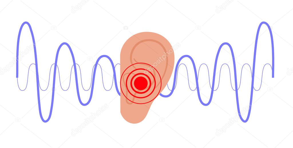 Tinnitus disease concept. Pain, inflammation in human ear. Symbol of earache, ringing and loud sounds in ears. Medical checkup of hearing organs, neurology problems treatment flat vector illustration.