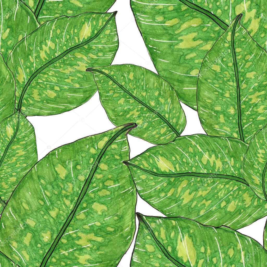 - Watercolor seamless pattern with tropical leaves. Beautiful allover print with hand drawn exotic plants. Swimwear botanical design.