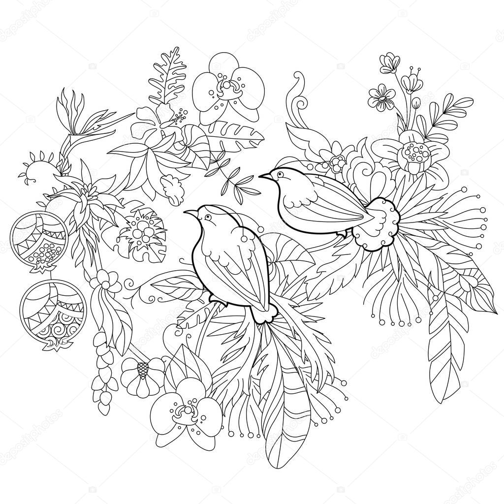 - Contour linear illustration for coloring book with paradise birds in flowers. Tropic birds, anti stress picture. Line art design for adult or kids in zen-tangle style, tattoo and coloring page.