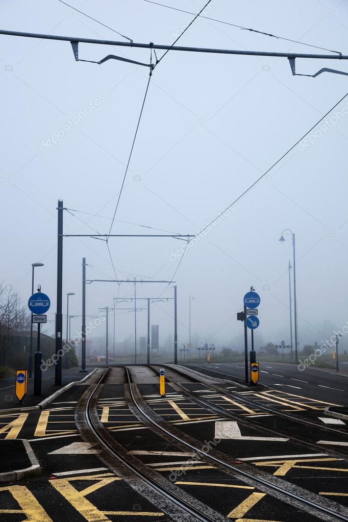 Tram tracks crossing through Manchester in a foggy evening.