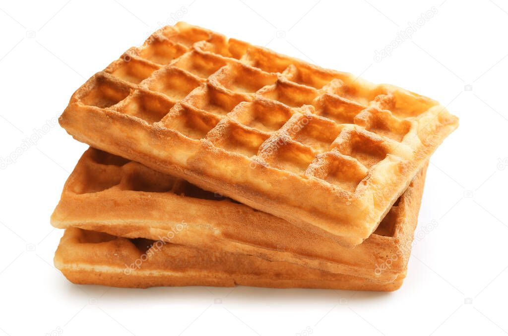 - Stack of tasty Belgian waffles on white background
