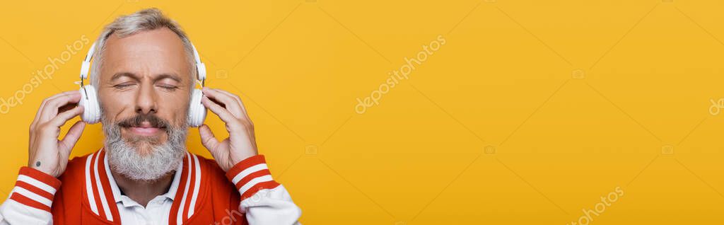 - pleased middle aged man in wireless headphones listening music isolated on yellow, banner