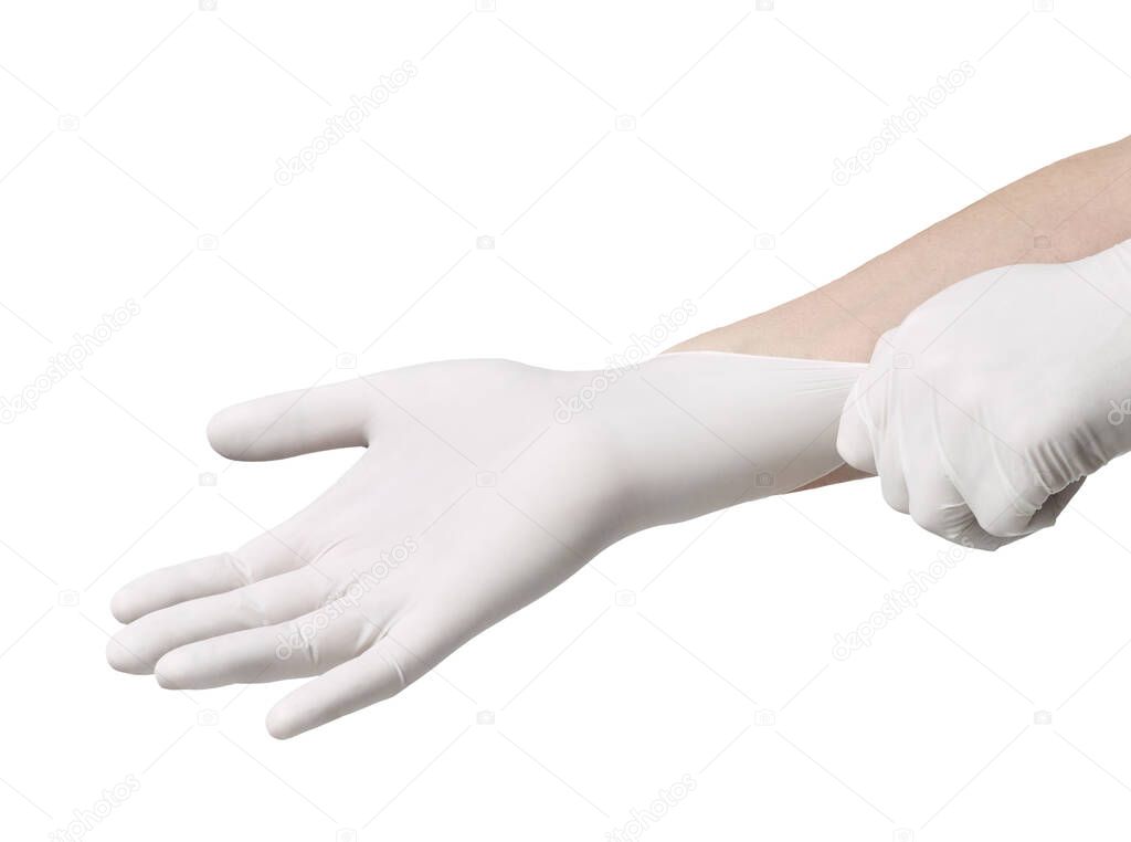 Close up of hands with white latex protective gloves on white background