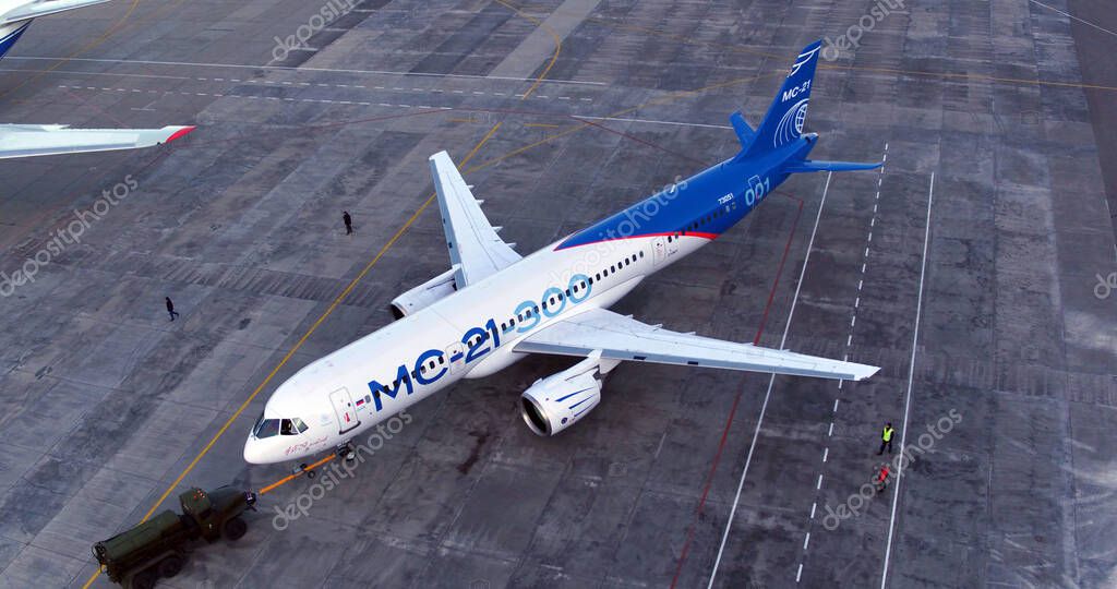 - Irkutsk, Russia - August 2019: New Russian civilian airliner Irkut MS-21 73053 before the first takeoff. IRKUT plant