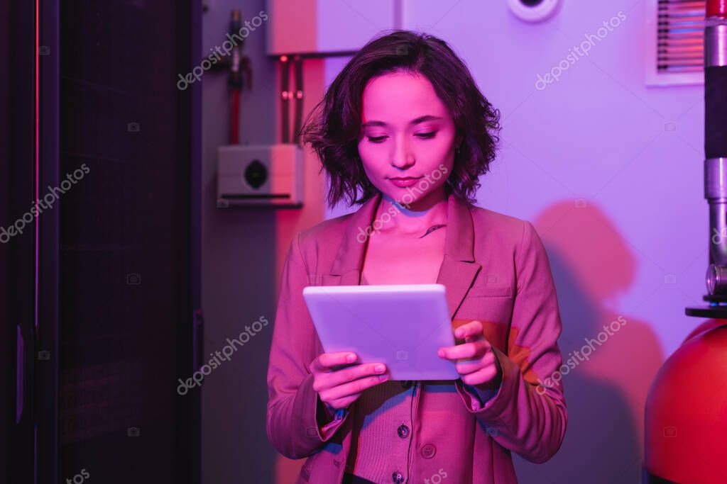 young woman using digital tablet while working in data center