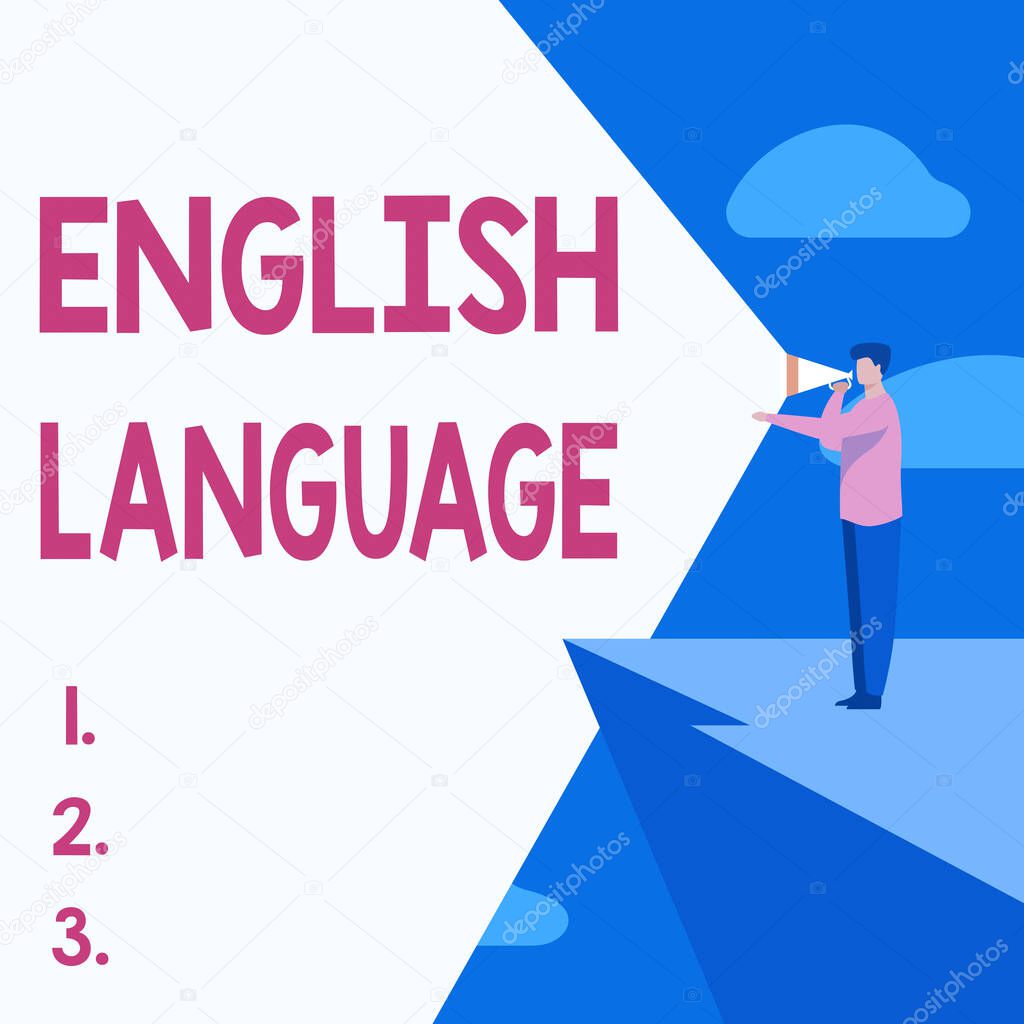 - Text showing inspiration English Language. Business idea third spoken native lang in world after Chinese and Spanish Businessman Drawing Standing In Cliff Using Megaphone Making Announcement.