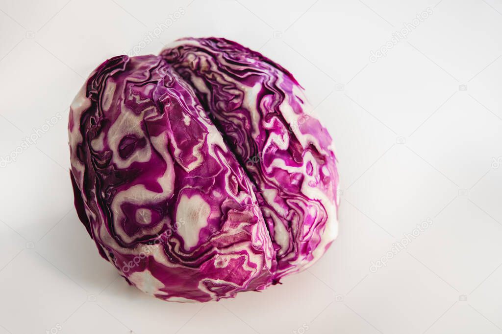 Red cabbage cut in a shape of brain. Healthy eating concept. Food for thought. Vegetables are useful for brain.