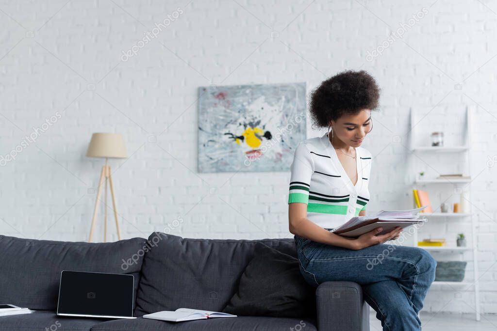 - curly african american woman looking at documents near laptop with blank screen on sofa