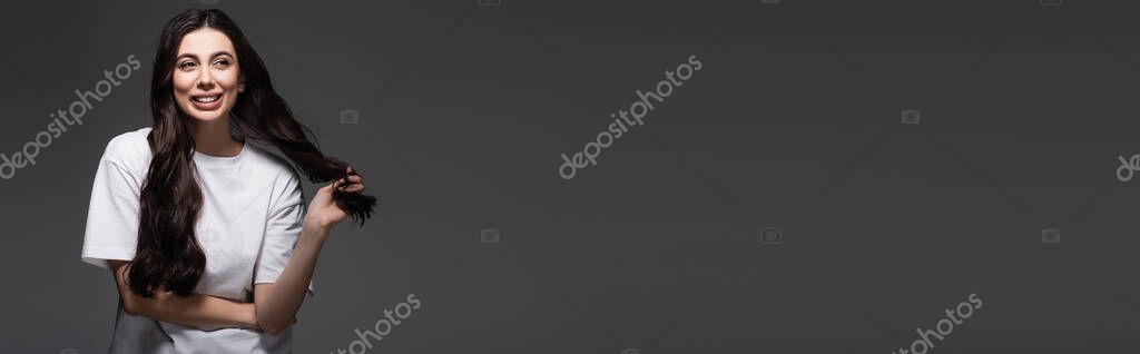 Young happy woman adjusting wavy hair on dark grey, banner