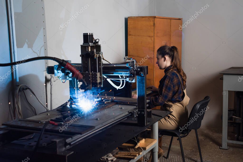Side view of welder sitting near keyboard and welding machine in factory