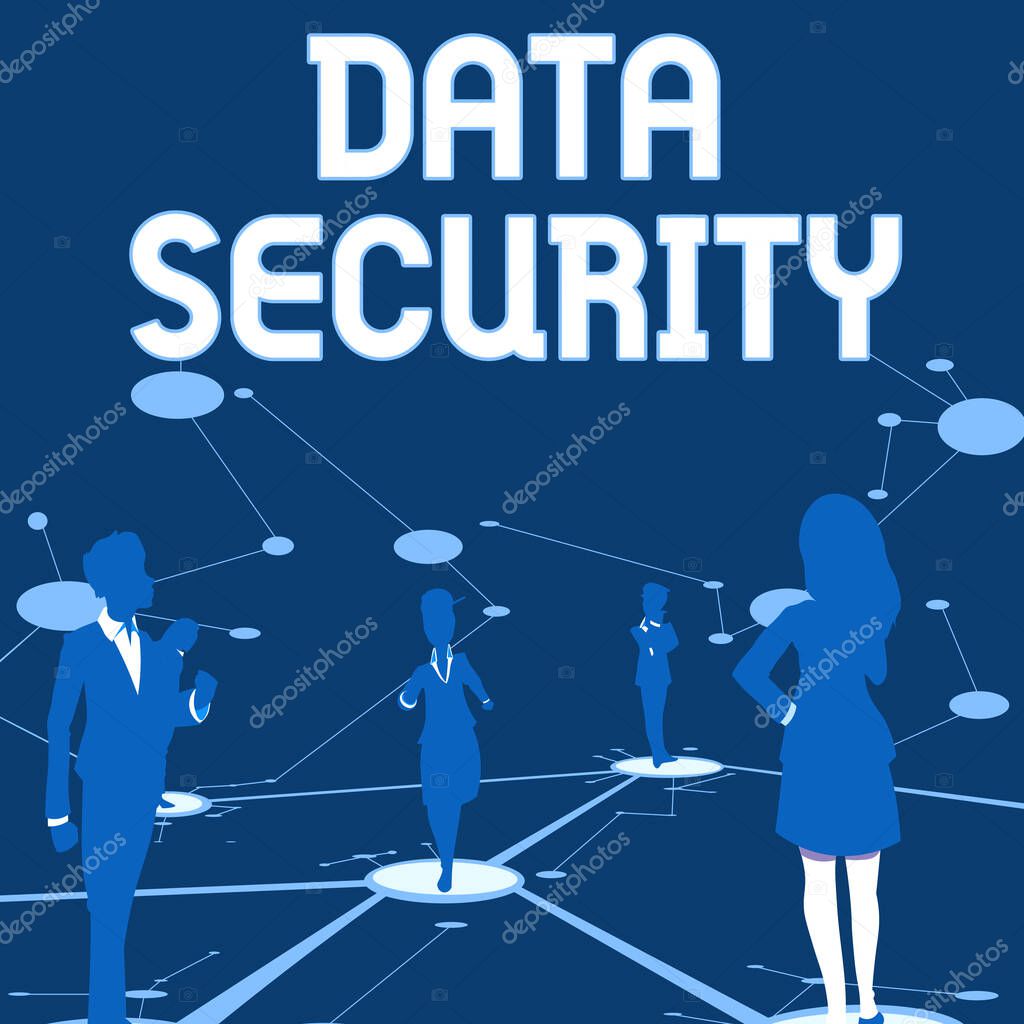 - Conceptual display Data Security. Internet Concept Confidentiality Disk Encryption Backups Password Shielding Several Team Members Standing Separate Thinking Connected Lines On Floor.