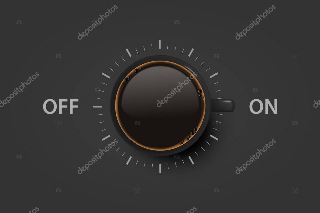 - Vector 3d Realistic Off, On Switch with Coffee in Black Ceramic, Porcelain Coffee Mug on Black. Coffee Cup Icon. Concept Creative Banner with Coffee Cup. Design Template. Top View
