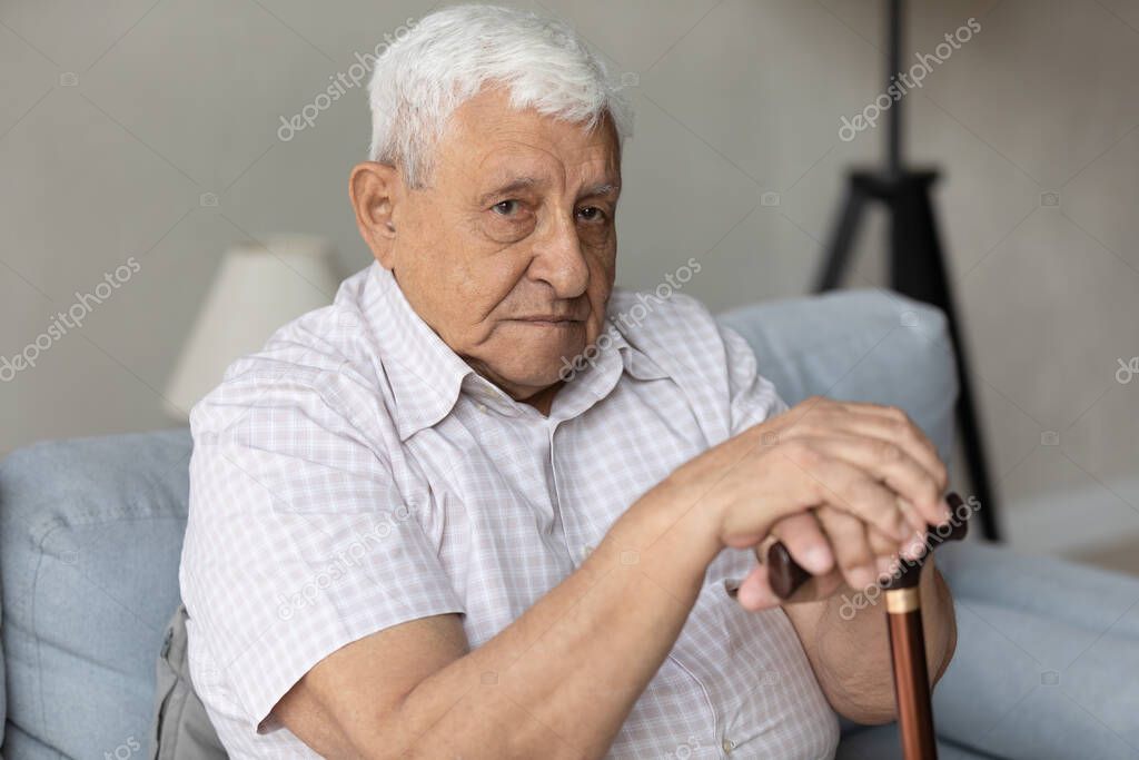 Unhappy pensive old senior retired grandfather with walking disability holding hands on wooden stick sitting on sofa, looking in distance feeling lonely, recollecting memories at home, ageing concept.