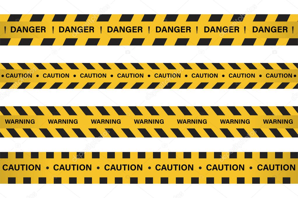 - Warning, danger sign with yellow and black color. Caution sign for police, accident, under construction, website. Vector danger sign. Caution tape set with black and yellow warning ribbons.