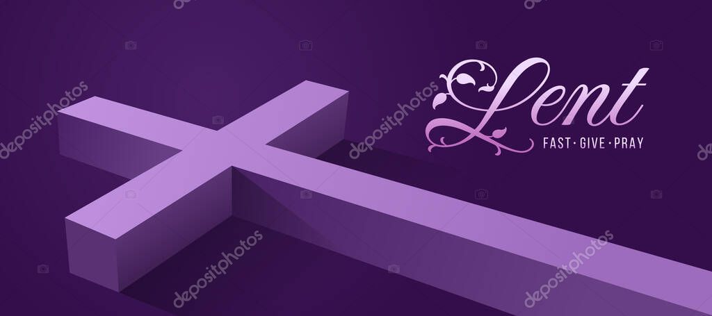 Lent - fast, give and pray text, purple religious cross put on dark purple background vector design