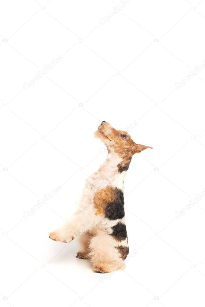 Wirehaired fox terrier sitting and looking up on white