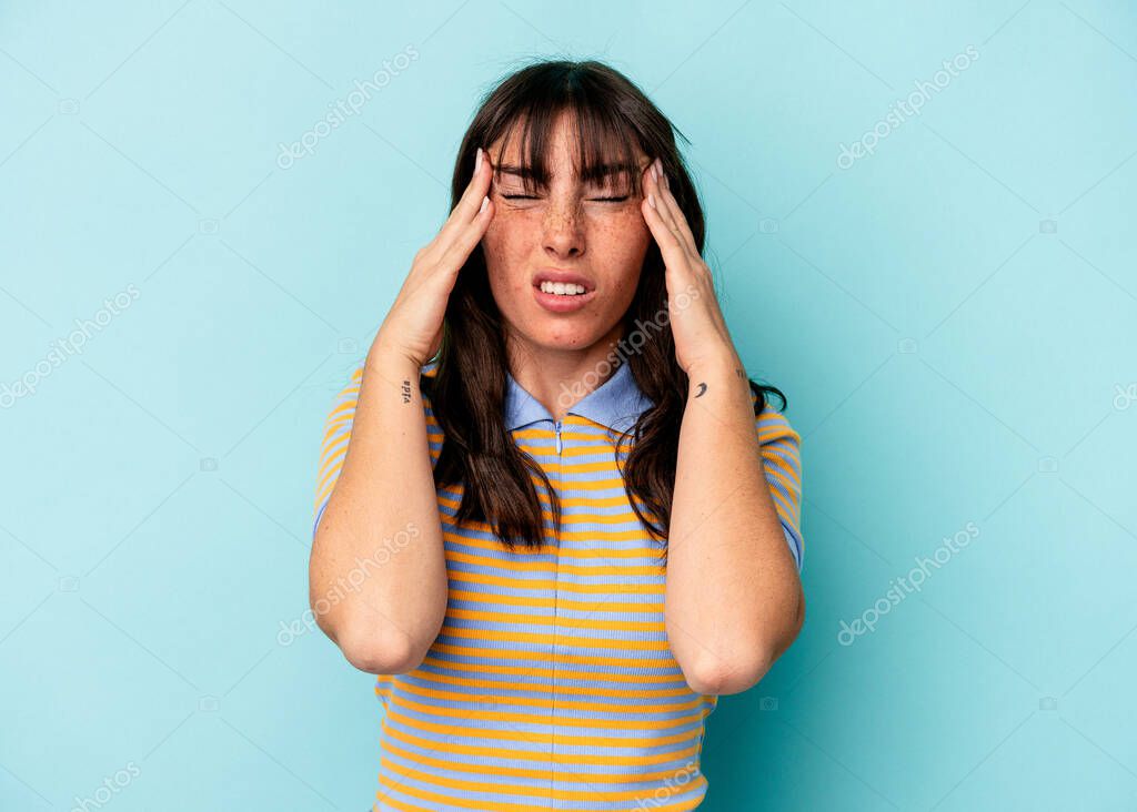 - Young Argentinian woman isolated on blue background touching temples and having headache.