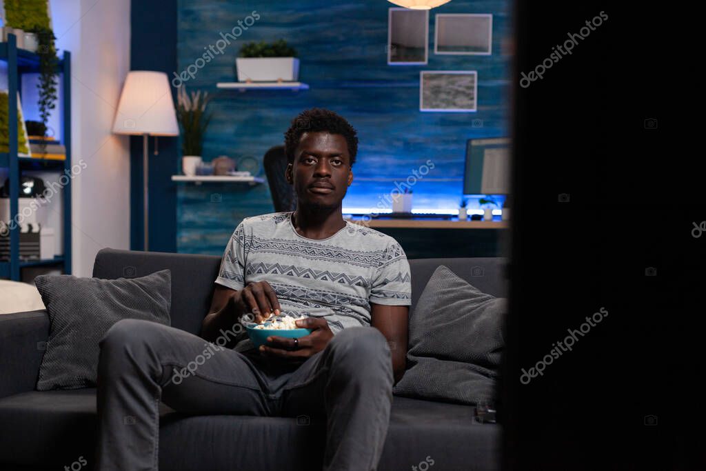 GAME SPORT LEISURE ACTIVITY COMPETITION FUN ENTERTAINMENT PERSON YOUNG JOY SPORTS SNACK MALE MAN BLACK TECHNOLOGY TIME WATCH MODERN AFRICAN CONCEPT REST RELAX INTERIOR BOWL HOME EVENING ROOM INDOORS FILM GUY ALONE WATCHING LIVING SOCCER FOOTBALL CHAMPIONSHIP GOAL SNACKS FREE ENJOYING MOVIE SOFA CHANNEL TV TELEVISION COUCH COMEDY POPCORN AFRICAN AMERICAN