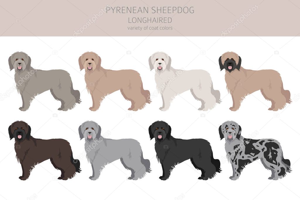 - Pyrenean sheepdog, longhaired clipart. Different poses, coat colors set. Vector illustration