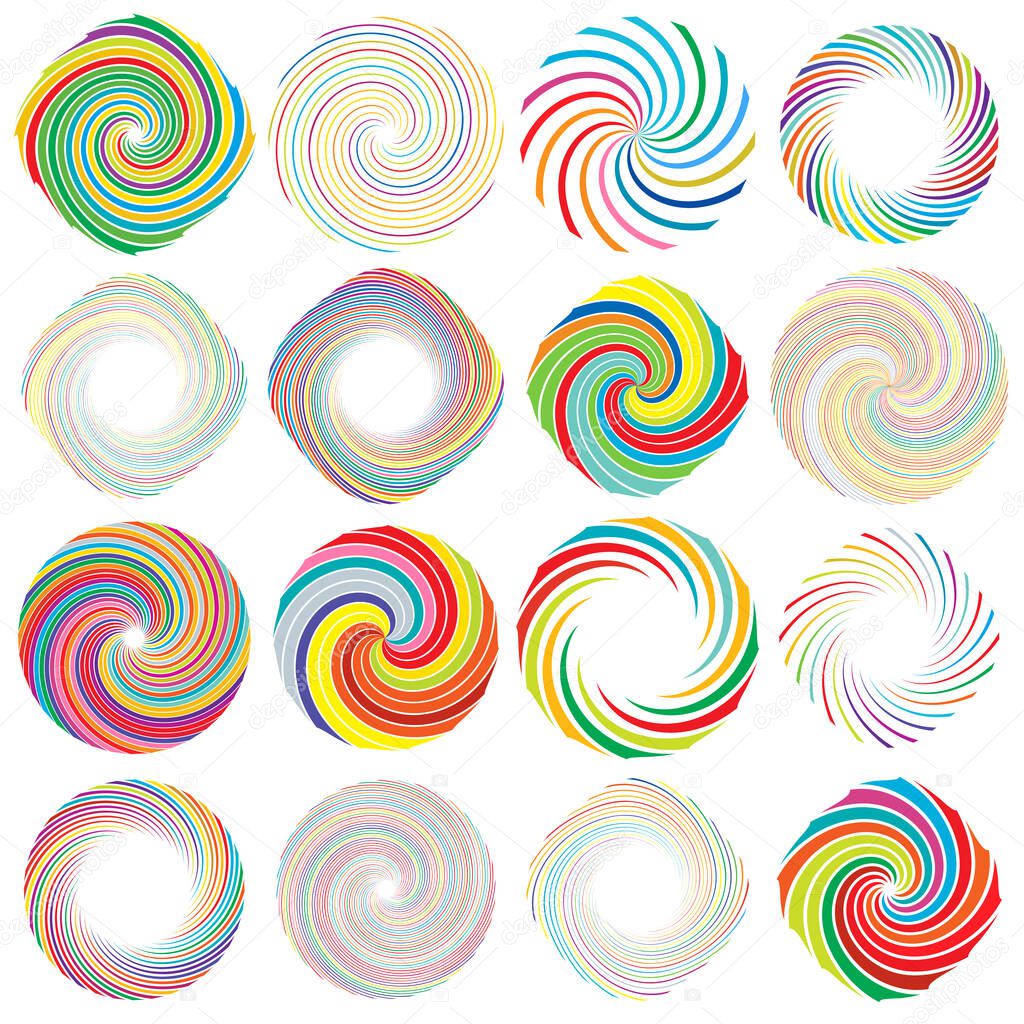 Twist, whirlwind, whirlpool elements. Vortex, volute element set. Circular concentric lines with rotation distortion