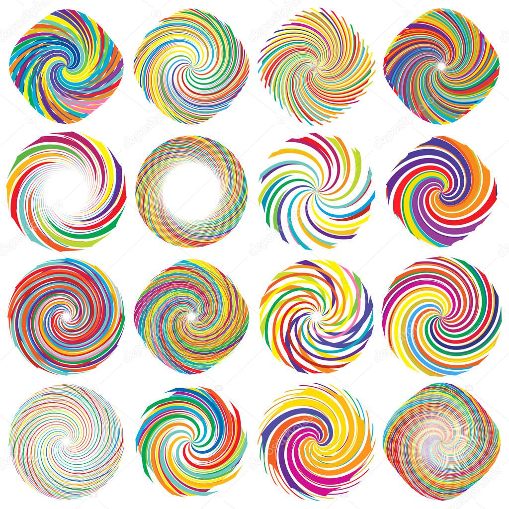 Twist, whirlwind, whirlpool elements. Vortex, volute element set. Circular concentric lines with rotation distortion