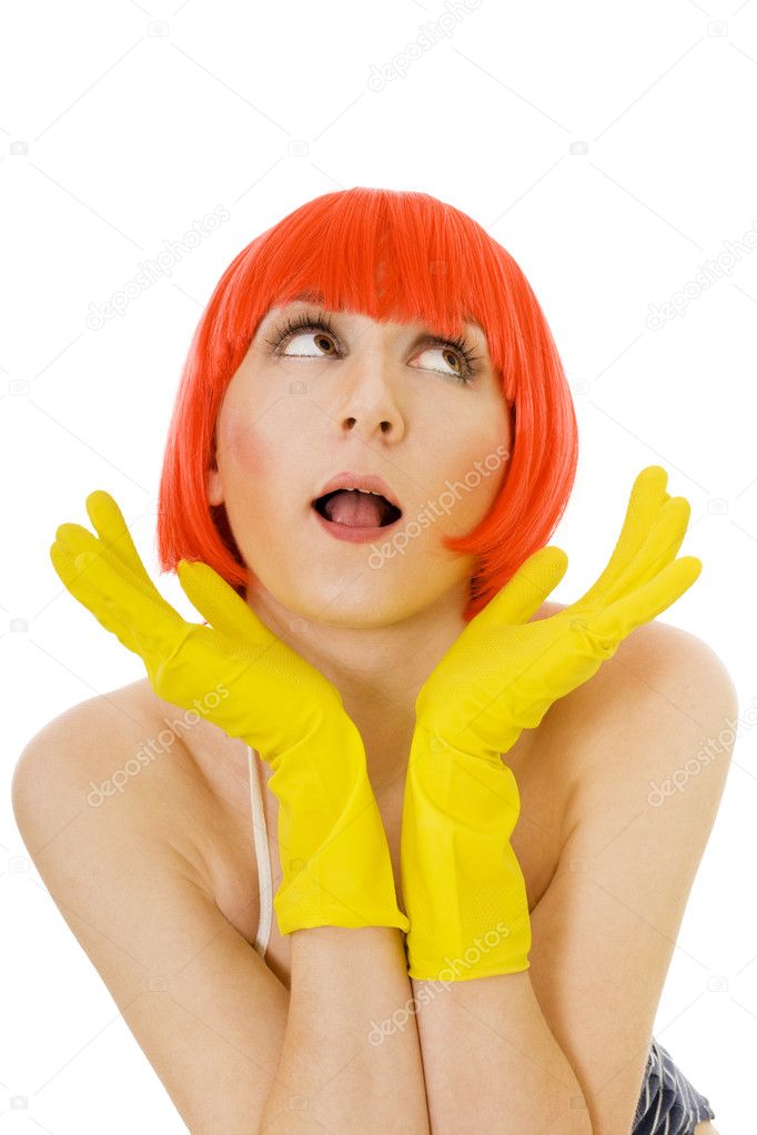 RED YELLOW ISOLATED BEAUTIFUL HAPPY CLOSEUP PERSON LOVE FEMALE ADULT WOMEN JOY SMILE HAIR PLAYFUL MOUTH FACE PLASTIC RUBBER HAND OPEN GLOVES SERVICE WOMAN TOUCH WITH WORK CLEAN HYGIENE LOOKING CHEMICAL LADY IN LOOK WASH ATTRACTIVE CHEMISTRY HYGIENIC SANITARY WEARING CLEANER MAINTENANCE CAREFREE GLOVE TOUNGUE AND WIG MAID CHARWOMAN GLOVED