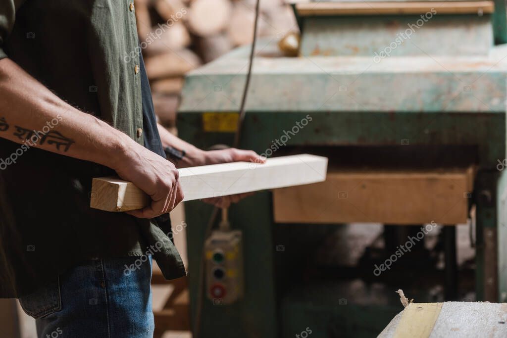 cropped view of carpenter with plank working on bench thickness tool in workshop