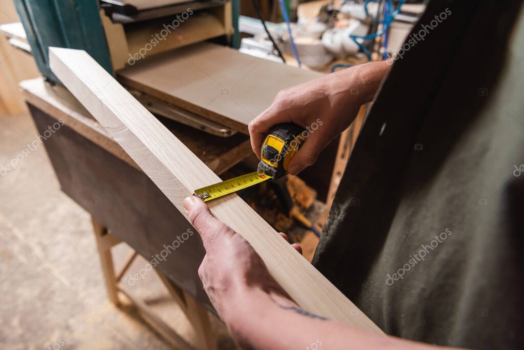 Cropped view of furniture designer measuring plank while working in woodwork studio