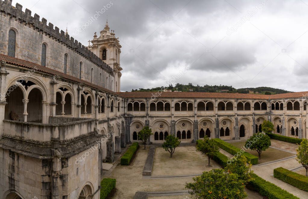 Alcobaca, Portugal - 7 April, 2022: cloister and church of the Alcobaca monastery