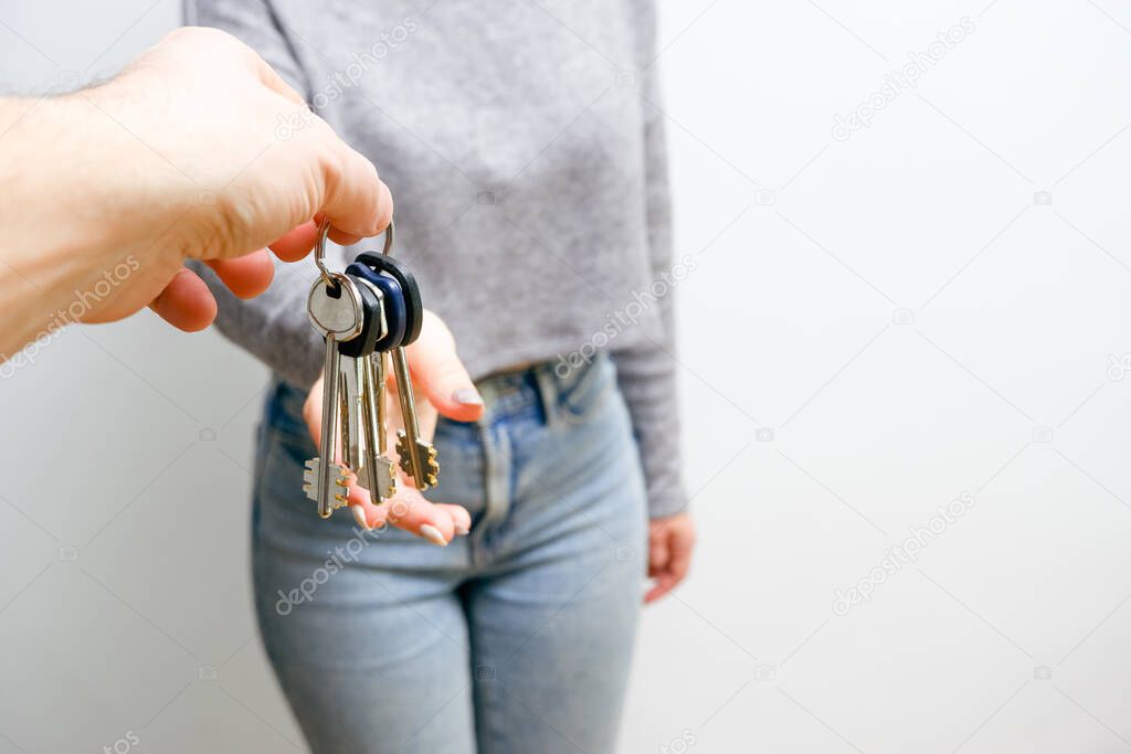Focus on female hand holding house keys. Woman realtor giving bunch to new happy owner of property. Holding in hands house and bunch of keys. People lifestyle concept.